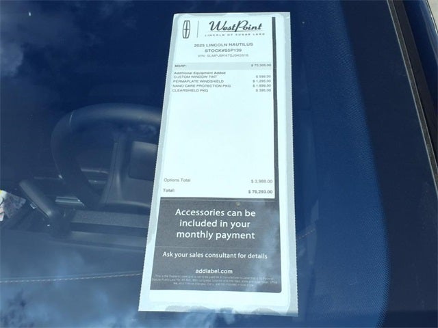 West Point Lincoln Sugar Land is honored to offer this attractive-looking 2025 Lincoln Nautilus Reserve in Red with Black Onyx interior. Well equipped with Equipment Group 203A Reserve III (110V Power Converter, Auto Air Refresh, BlueCruise Equipped (4-Years Included), Digital Scent, Hands-Free Power Liftgate, Lincoln Rejuventate, Panoramic Vista Roof w/Powershade, Premium Leather-Trimmed Heat/Vent Captain's Chairs, Radio: AM/FM Revel Ultima 3D Audio System, and Rear Heated Seats w/Switch Control), Jet Appearance Package (Black Exterior Elements, Body Color, and Wheels: 22 Satin Dark Luster Aluminum), 10 Speakers, 4-Wheel Disc Brakes, ABS brakes, Adaptive suspension, Air Conditioning, Alloy wheels, AM/FM radio: SiriusXM with 360L, Apple CarPlay/Android Auto, Auto High-beam Headlights, Auto tilt-away steering wheel, Auto-dimming Rear-View mirror, Automatic temperature control, Brake assist, Bumpers: body-color, Compass, Delay-off headlights, Driver door bin, Driver vanity mirror, Dual front impact airbags, Dual front side impact airbags, Electronic Stability Control, Emergency communication system: 911 Assist, Exterior Parking Camera Rear, Four wheel independent suspension, Front anti-roll bar, Front Bucket Seats, Front Center Armrest w/Storage, Front dual zone A/C, Front reading lights, Fully automatic headlights, Garage door transmitter: HomeLink, Heated door mirrors, Heated front seats, Heated steering wheel, Illuminated entry, Knee airbag, Leather steering wheel, Lincoln Digital Experience, Low tire pressure warning, Memory seat, Navigation System, Occupant sensing airbag, Outside temperature display, Overhead airbag, Overhead console, Panic alarm, Passenger door bin, Passenger vanity mirror, Power door mirrors, Power driver seat, Power Liftgate, Power passenger seat, Power steering, Power windows, Prem Lthr-Trimmed Htd/Ventilated Captain's Chairs, Radio data system, Radio: AM/FM Revel Audio System, Rain sensing wipers, Rear anti-roll bar, Rear reading lights, Rear seat center armrest, Rear window defroster, Rear window wiper, Remote keyless entry, Security system, SiriusXM w/360L, Speed control, Speed-sensing steering, Speed-Sensitive Wipers, Split folding rear seat, Spoiler, Steering wheel memory, Steering wheel mounted audio controls, Tachometer, Telescoping steering wheel, Tilt steering wheel, Traction control, Trip computer, Turn signal indicator mirrors, Variably intermittent wipers, and Wheels: 21 Bright Machined Aluminum.