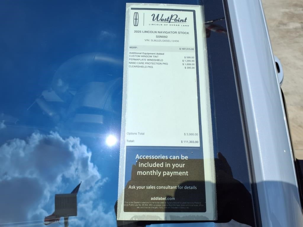West Point Lincoln Sugar Land is pleased to offer this great-looking 2025 Lincoln Navigator Reserve in Crystal White with Black Onyx interior. Well equipped with Equipment Group 202A Reserve II, Jet Appearance Package (Black Accent Badge, Black Accent Interior Pack, Black Beltline Molding, Black Painted Roof Rails, Front Bumper Fascia, Lincoln Lit Star, Unique Lincoln Grille Pillar Black Surround, and Wheels: 22 High-Gloss Ebony Aluminum), 28 Speakers, 3rd row seats: split-bench, 4-Wheel Disc Brakes, ABS brakes, Adaptive suspension, Adjustable pedals, Air Conditioning, All-Weather Flr Liners w/Fr & Rr Carpet Floor Mats, Alloy wheels, AM/FM radio: SiriusXM with 360L, Apple CarPlay/Android Auto, Audio memory, Auto High-beam Headlights, Auto Htd & Ventilated Premium Lthr Captain's Chair, Auto Start-Stop Technology, Auto tilt-away steering wheel, Auto-dimming door mirrors, Auto-dimming Rear-View mirror, Auto-leveling suspension, Automatic temperature control, Brake assist, Bumpers: body-color, Cargo Area Protector w/3rd Row Seat Back, Compass, Delay-off headlights, Driver door bin, Driver vanity mirror, Driver's Seat Mounted Armrest, Dual front impact airbags, Dual front side impact airbags, Electronic Stability Control, Emergency communication system: 911 Assist, Exterior Parking Camera Rear, First Aid Kit w/Lincoln Logo, Four wheel independent suspension, Front anti-roll bar, Front Bucket Seats, Front dual zone A/C, Front License Plate Bracket, Front reading lights, Fully automatic headlights, Garage door transmitter, Heated door mirrors, Heated front seats, Heated rear seats, Heated steering wheel, HVAC memory, Illuminated entry, Leather steering wheel, Lincoln Connect, Lincoln Premium Connectivity, Low tire pressure warning, Memory seat, Navigation system: Connected Navigation (1-year trial), Occupant sensing airbag, Outside temperature display, Overhead airbag, Overhead console, Panic alarm, Passenger door bin, Passenger seat mounted armrest, Passenger vanity mirror, Pedal memory, Power adjustable rear head restraints, Power door mirrors, Power driver seat, Power moonroof: Panoramic Vista Roof, Power passenger seat, Power steering, Power windows, Radio data system, Radio: Revel Ultima 3D AM/FM/HD Audio System, Rain sensing wipers, Rear air conditioning, Rear anti-roll bar, Rear audio controls, Rear reading lights, Rear window defroster, Rear window wiper, Reclining 3rd row seat, Remote keyless entry, Roadside Assistance Kit w/Lincoln Logo, Security system, SiriusXM w/360L, Speed control, Speed-sensing steering, Speed-Sensitive Wipers, Split folding rear seat, Spoiler, Steering wheel memory, Steering wheel mounted audio controls, Tachometer, Telescoping steering wheel, Tilt steering wheel, Traction control, Trip computer, Turn signal indicator mirrors, Variably intermittent wipers, Ventilated front seats, and Wheels: 22 Dark Tarnished Aluminum.