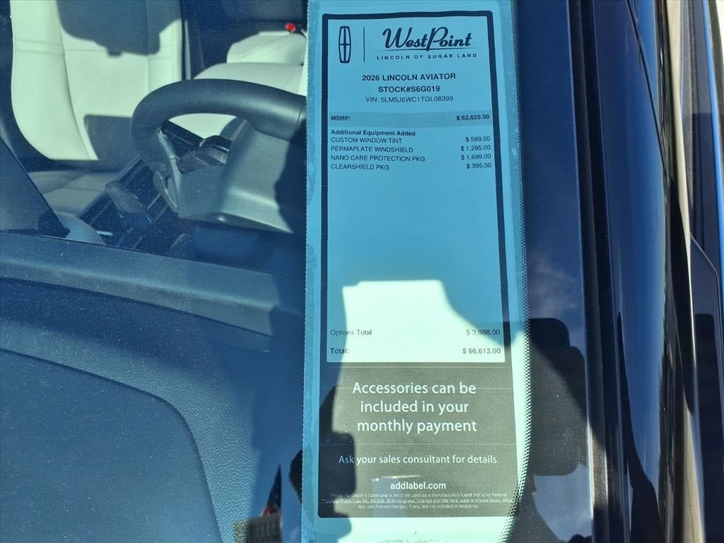 West Point Lincoln Sugar Land is delighted to offer this superb-looking 2026 Lincoln Aviator Premiere in White Metallic with Light Space Gray & Onyx interior. Well equipped with Equipment Group 101A Premiere II (Auto Air Refresh, Lincoln App, Lincoln BlueCruise Equipped (4-Years Included), Lincoln Digital Experience, Lincoln Soft Touch Comfort Seats, Panoramic Vista Roof with Power Shade, Power Tilt Telescoping Steering Column with Memory, Radio: Lincoln Premium AM/FM/HD Audio System with 10 Speakers, SiriusXM, Wheels: 20 Magnetic Bright-Machined Aluminum, and Wireless Charging), Lincoln Connectivity Package (4-Years), 10 Speakers, 3rd row seats: split-bench, 4-Wheel Disc Brakes, ABS brakes, Adaptive suspension, Air Conditioning, Alloy wheels, AM/FM radio: SiriusXM, Apple CarPlay/Android Auto, Audio memory, Auto High-beam Headlights, Auto-dimming door mirrors, Auto-dimming Rear-View mirror, Automatic temperature control, Brake assist, Bumpers: body-color, Compass, Delay-off headlights, Driver door bin, Driver vanity mirror, Dual front impact airbags, Dual front side impact airbags, Electronic Stability Control, Emergency communication system: 911 Assist, Four wheel independent suspension, Front anti-roll bar, Front Bucket Seats, Front Center Armrest, Front dual zone A/C, Front License Plate Bracket, Front reading lights, Fully automatic headlights, Garage door transmitter, Heads-Up Display, Heated door mirrors, Heated Front Driver and Passenger Seats, Heated front seats, Heated steering wheel, HVAC memory, Illuminated entry, Knee airbag, Leather steering wheel, Low tire pressure warning, Memory seat, Navigation system: Google Maps, Occupant sensing airbag, Outside temperature display, Overhead airbag, Overhead console, Panic alarm, Passenger door bin, Passenger vanity mirror, Power door mirrors, Power driver seat, Power Liftgate, Power passenger seat, Power steering, Power windows, Radio data system, Rain sensing wipers, Rear air conditioning, Rear anti-roll bar, Rear audio controls, Rear reading lights, Rear window defroster, Rear window wiper, Remote keyless entry, Security system, Speed control, Speed-Sensitive Wipers, Split folding rear seat, Spoiler, Steering wheel mounted A/C controls, Steering wheel mounted audio controls, Tachometer, Telescoping steering wheel, Tilt steering wheel, Traction control, Trip computer, Turn signal indicator mirrors, and Variably intermittent wipers.