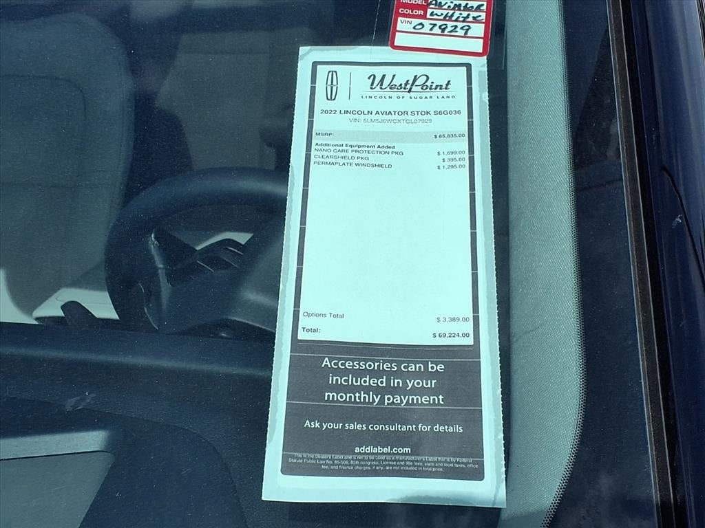 West Point Lincoln Sugar Land is pumped up to offer this superb 2026 Lincoln Aviator Premiere in White Metallic with Light Space Gray & Onyx interior. Well equipped with Equipment Group 102A Premiere III (Advanced Heads-Up Display, Auto Air Refresh, Heated 2nd Row Seats, Lincoln BlueCruise Equipped (4-Years Included), Lincoln Soft Touch Comfort Seats, Panoramic Vista Roof with Power Shade, Power Tilt Telescoping Steering Column with Memory, Radio: Revel Audio System with 14 Speakers, Wheels: 20 Magnetic Bright-Machined Aluminum, and Wireless Charging), Lincoln Connectivity Package (4-Years), 10 Speakers, 3rd row seats: split-bench, 4-Wheel Disc Brakes, ABS brakes, Adaptive suspension, Air Conditioning, Alloy wheels, AM/FM radio: SiriusXM, Apple CarPlay/Android Auto, Audio memory, Auto High-beam Headlights, Auto-dimming door mirrors, Auto-dimming Rear-View mirror, Automatic temperature control, Brake assist, Bumpers: body-color, Compass, Delay-off headlights, Driver door bin, Driver vanity mirror, Dual front impact airbags, Dual front side impact airbags, Electronic Stability Control, Emergency communication system: 911 Assist, Four wheel independent suspension, Front anti-roll bar, Front Bucket Seats, Front Center Armrest, Front dual zone A/C, Front License Plate Bracket, Front reading lights, Fully automatic headlights, Garage door transmitter, Heads-Up Display, Heated door mirrors, Heated Front Driver and Passenger Seats, Heated front seats, Heated steering wheel, HVAC memory, Illuminated entry, Knee airbag, Leather steering wheel, Lincoln App, Lincoln Digital Experience, Low tire pressure warning, Memory seat, Navigation system: Google Maps, Occupant sensing airbag, Outside temperature display, Overhead airbag, Overhead console, Panic alarm, Passenger door bin, Passenger vanity mirror, Power door mirrors, Power driver seat, Power Liftgate, Power passenger seat, Power steering, Power windows, Radio data system, Radio: Lincoln Premium AM/FM/HD Audio System with 10 Speakers, Rain sensing wipers, Rear air conditioning, Rear anti-roll bar, Rear audio controls, Rear reading lights, Rear window defroster, Rear window wiper, Remote keyless entry, Security system, SiriusXM, Speed control, Speed-Sensitive Wipers, Split folding rear seat, Spoiler, Steering wheel mounted A/C controls, Steering wheel mounted audio controls, Tachometer, Telescoping steering wheel, Tilt steering wheel, Traction control, Trip computer, Turn signal indicator mirrors, and Variably intermittent wipers.