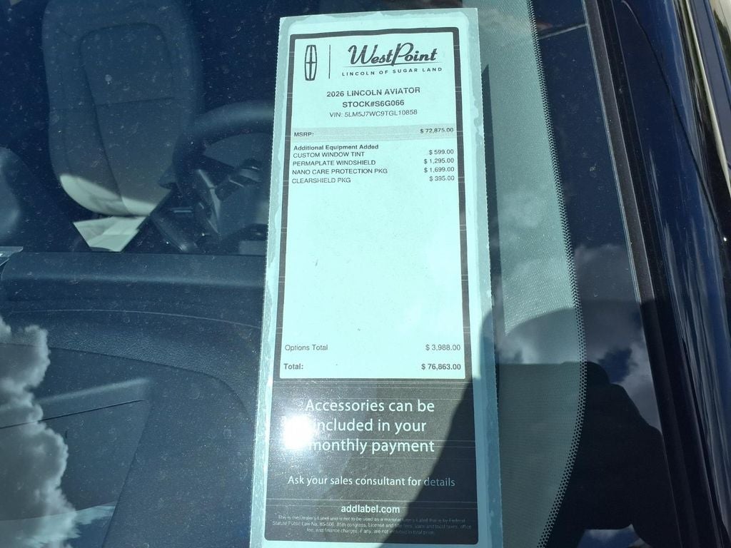 West Point Lincoln Sugar Land is proud to offer this great-looking 2026 Lincoln Aviator Reserve in Blue Metallic with Light Space Gray & Onyx interior. Well equipped with Equipment Group 200A Reserve I (Advanced Heads-Up Display, Auto Air Refresh, Auto Heated and Ventilated Driver and Passenger Seats, Lincoln App, Lincoln BlueCruise Equipped (4-Years Included), Lincoln Digital Experience, Premium Leather Front Captain's Chairs, Radio: Revel Audio System with 14 Speakers, SiriusXM, Wheels: 21 Bright-Machined Aluminum with Dark Alloy Painted Pockets, and Wireless Charging Pad), Jet Appearance Package (40/Mini Console/40 Dual Captain's Chairs, Black Exterior Elements, Body-Color Exterior Elements, and Wheels: 22 Black Aluminum), Lincoln Connectivity Package (4-Years), 14 Speakers, 3rd row seats: split-bench, 4-Wheel Disc Brakes, ABS brakes, Adaptive suspension, Air Conditioning, Alloy wheels, AM/FM radio: SiriusXM, Apple CarPlay/Android Auto, Audio memory, Auto High-beam Headlights, Auto-dimming door mirrors, Auto-dimming Rear-View mirror, Automatic temperature control, Brake assist, Bumpers: body-color, Compass, Delay-off headlights, Driver door bin, Driver vanity mirror, Dual front impact airbags, Dual front side impact airbags, Electronic Stability Control, Emergency communication system: 911 Assist, Four wheel independent suspension, Front anti-roll bar, Front Bucket Seats, Front Center Armrest, Front dual zone A/C, Front License Plate Bracket, Front reading lights, Fully automatic headlights, Garage door transmitter, Genuine wood console insert, Genuine wood dashboard insert, Heads-Up Display, Heated door mirrors, Heated front seats, Heated steering wheel, HVAC memory, Illuminated entry, Knee airbag, Leather steering wheel, Low tire pressure warning, Memory seat, Navigation system: Google Maps, Occupant sensing airbag, Outside temperature display, Overhead airbag, Overhead console, Panic alarm, Passenger door bin, Passenger vanity mirror, Power door mirrors, Power driver seat, Power Liftgate, Power moonroof: Panoramic Vista Roof, Power passenger seat, Power steering, Power windows, Radio data system, Rain sensing wipers, Rear air conditioning, Rear anti-roll bar, Rear audio controls, Rear dual zone A/C, Rear reading lights, Rear window defroster, Rear window wiper, Remote keyless entry, Security system, Speed control, Speed-Sensitive Wipers, Split folding rear seat, Spoiler, Steering wheel memory, Steering wheel mounted A/C controls, Steering wheel mounted audio controls, Tachometer, Telescoping steering wheel, Tilt steering wheel, Traction control, Trip computer, Turn signal indicator mirrors, Variably intermittent wipers, and Ventilated front seats.