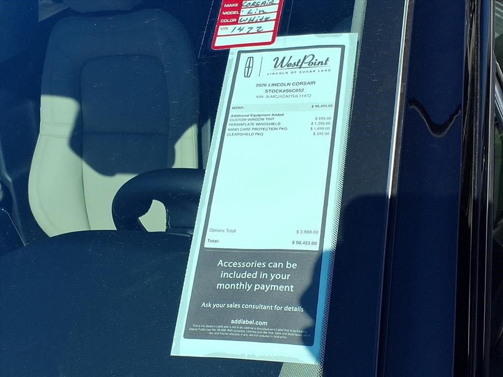 West Point Lincoln Sugar Land is pumped up to offer this attractive-looking 2026 Lincoln Corsair Premiere in White Metallic with Light Smoked Truffle interior. Well equipped with Equipment Group 101A (18 Bright Machined Aluminum Wheels, 2 Additional USB Ports in Rear of Center Console, 60/40 EasyFold Rear Seat w/Power Seatback Release, Frameless Auto Dimming Rearview Mirror, Hands-Free Liftgate, Heated Sideview Mirrors, Heated Steering Wheel, Heated/Ventilated Driver & Front Passenger Seats, Micro-Perf Lincoln Soft Touch Captain's Chairs, Phone As A Key (PAAK), Power Tilt/Telescoping Steering Column w/Memory, Rain Sensing Wipers, Universal Garage Door Opener, Windshield Wiper De-Icer, and Wireless Charging Pad), Jet Appearance Package (Body-Color Exterior Elements, Pillar Black Exterior Elements, and Wheels: 20 Black Aluminum), 360-Degree Camera, 4-Wheel Disc Brakes, 9 Speakers, ABS brakes, Air Conditioning, Alexa Built-In, All-Weather Floor Liners w/Fr&Rr Carpet Floor Mats, Alloy wheels, AM/FM radio: SiriusXM with 360L, Apple CarPlay/Android Auto, Auto High-beam Headlights, Auto-dimming Rear-View mirror, Automatic temperature control, Brake assist, Bumpers: body-color, Compass, Delay-off headlights, Driver door bin, Driver vanity mirror, Dual front impact airbags, Dual front side impact airbags, Electronic Stability Control, Emergency communication system: 911 Assist, Exterior Parking Camera Rear, Four wheel independent suspension, Front anti-roll bar, Front Bucket Seats, Front Center Armrest, Front dual zone A/C, Front License Plate Bracket, Front Parking Sensors, Front reading lights, Fully automatic headlights, Heated door mirrors, Heated front seats, Illuminated entry, Knee airbag, Leather steering wheel, Lincoln Soft Touch Heated Front Captain's Chairs, Low tire pressure warning, Memory seat, Navigation system: Connected Navigation (4-year trial), Occupant sensing airbag, Outside temperature display, Overhead airbag, Overhead console, Panic alarm, Passenger door bin, Passenger vanity mirror, Post-Collision Braking, Power door mirrors, Power driver seat, Power Liftgate, Power passenger seat, Power steering, Power windows, Radio data system, Radio: Lincoln Premium Audio System w/MP3, Rear anti-roll bar, Rear Parking Sensors, Rear reading lights, Rear seat center armrest, Rear window defroster, Rear window wiper, Remote keyless entry, Reverse Brake Assist, Security system, SiriusXM w/360L Radio, Speed control, Speed-sensing steering, Speed-Sensitive Wipers, Split folding rear seat, Spoiler, Steering wheel mounted A/C controls, Steering wheel mounted audio controls, SYNC 4, Tachometer, Telescoping steering wheel, Tilt steering wheel, Traction control, Trip computer, Variably intermittent wipers, and Wheels: 18 Warm Painted Alloy.