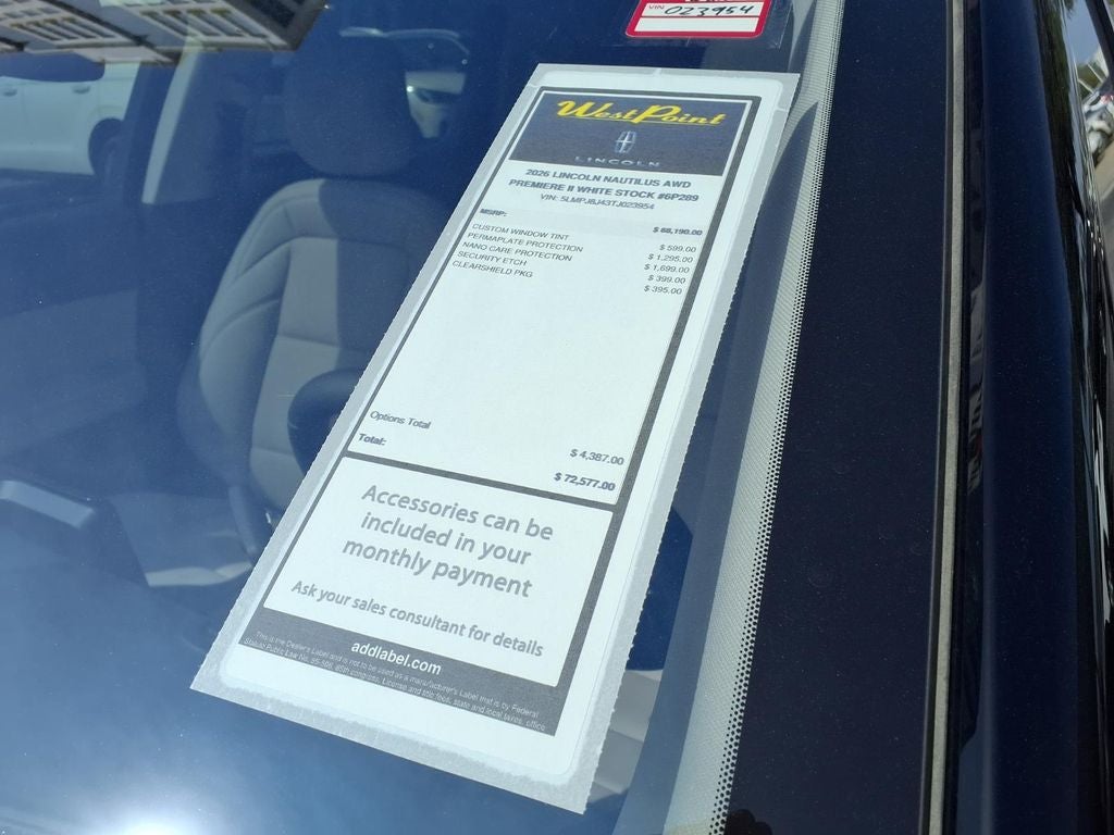 West Point Lincoln Sugar Land is very proud to offer this superb 2026 Lincoln Nautilus Premiere in White Platinum Clearcoat Metallic with Medium Light Space Gray interior. Well equipped with Equipment Group 102A (110V Power Converter, 19 Bright Machined Aluminum Wheels, Auto Air Refresh, BlueCruise Equipped (4-Years Included), Digital Scent, Hands-Free Power Liftgate, Lincoln Soft Touch Heated Front Captain's Chairs, Panoramic Vista Roof with Powershade, Radio: AM/FM Revel Audio System, Rear Heated Seats with Switch Control, SiriusXM with 360L, and Ventilated Front Seats), Jet Appearance Package (Black Exterior Elements, Body-Color Exterior Elements, Molded in Color - Lower Cladding and Wheel Arches, and Wheels: 20 Bright Machined Aluminum), Lincoln Connectivity Package, 10 Speakers, 4-Wheel Disc Brakes, ABS brakes, Air Conditioning, Alloy wheels, AM/FM radio: SiriusXM with 360L, Apple CarPlay/Android Auto, Auto High-beam Headlights, Auto tilt-away steering wheel, Auto-dimming Rear-View mirror, Automatic temperature control, Brake assist, Bumpers: body-color, Compass, Delay-off headlights, Driver door bin, Driver vanity mirror, Dual front impact airbags, Dual front side impact airbags, Electronic Stability Control, Emergency communication system: 911 Assist, Exterior Parking Camera Rear, Four wheel independent suspension, Front anti-roll bar, Front Bucket Seats, Front Center Armrest w/Storage, Front dual zone A/C, Front reading lights, Fully automatic headlights, Garage door transmitter, Heated door mirrors, Heated front seats, Heated steering wheel, Illuminated entry, Knee airbag, Leather steering wheel, Lincoln App, Lincoln Digital Experience, Low tire pressure warning, Memory seat, Navigation System, Occupant sensing airbag, Outside temperature display, Overhead airbag, Overhead console, Panic alarm, Passenger door bin, Passenger vanity mirror, Power door mirrors, Power driver seat, Power Liftgate, Power passenger seat, Power steering, Power windows, Radio data system, Radio: AM/FM Premium Audio, Rain sensing wipers, Rear anti-roll bar, Rear reading lights, Rear seat center armrest, Rear window defroster, Rear window wiper, Remote keyless entry, Security system, Speed control, Speed-sensing steering, Speed-Sensitive Wipers, Split folding rear seat, Spoiler, Steering wheel memory, Steering wheel mounted audio controls, Tachometer, Telescoping steering wheel, Tilt steering wheel, Traction control, Trip computer, Turn signal indicator mirrors, and Variably intermittent wipers.
