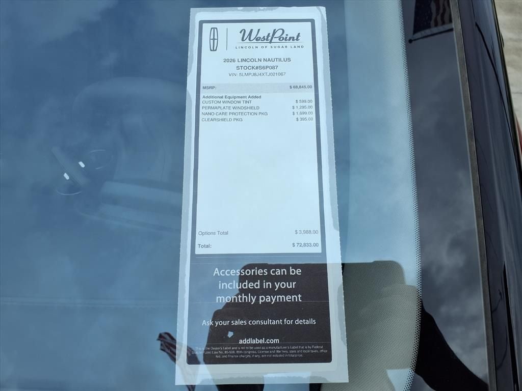 West Point Lincoln Sugar Land is proud to offer this good-looking 2026 Lincoln Nautilus Premiere in Red with Black Onyx interior. Well equipped with Equipment Group 102A (110V Power Converter, 19 Bright Machined Aluminum Wheels, Auto Air Refresh, BlueCruise Equipped (4-Years Included), Digital Scent, Hands-Free Power Liftgate, Lincoln Soft Touch Heated Front Captain's Chairs, Panoramic Vista Roof with Powershade, Radio: AM/FM Revel Audio System, Rear Heated Seats with Switch Control, SiriusXM with 360L, and Ventilated Front Seats), Jet Appearance Package (Black Exterior Elements, Body-Color Exterior Elements, Molded in Color - Lower Cladding and Wheel Arches, and Wheels: 20 Bright Machined Aluminum), Lincoln Connectivity Package, 10 Speakers, 4-Wheel Disc Brakes, ABS brakes, Air Conditioning, Alloy wheels, AM/FM radio: SiriusXM with 360L, Apple CarPlay/Android Auto, Auto High-beam Headlights, Auto tilt-away steering wheel, Auto-dimming Rear-View mirror, Automatic temperature control, Brake assist, Bumpers: body-color, Compass, Delay-off headlights, Driver door bin, Driver vanity mirror, Dual front impact airbags, Dual front side impact airbags, Electronic Stability Control, Emergency communication system: 911 Assist, Exterior Parking Camera Rear, Four wheel independent suspension, Front anti-roll bar, Front Bucket Seats, Front Center Armrest w/Storage, Front dual zone A/C, Front reading lights, Fully automatic headlights, Garage door transmitter, Heated door mirrors, Heated front seats, Heated steering wheel, Illuminated entry, Knee airbag, Leather steering wheel, Lincoln App, Lincoln Digital Experience, Low tire pressure warning, Memory seat, Navigation System, Occupant sensing airbag, Outside temperature display, Overhead airbag, Overhead console, Panic alarm, Passenger door bin, Passenger vanity mirror, Power door mirrors, Power driver seat, Power Liftgate, Power passenger seat, Power steering, Power windows, Radio data system, Radio: AM/FM Premium Audio, Rain sensing wipers, Rear anti-roll bar, Rear reading lights, Rear seat center armrest, Rear window defroster, Rear window wiper, Remote keyless entry, Security system, Speed control, Speed-sensing steering, Speed-Sensitive Wipers, Split folding rear seat, Spoiler, Steering wheel memory, Steering wheel mounted audio controls, Tachometer, Telescoping steering wheel, Tilt steering wheel, Traction control, Trip computer, Turn signal indicator mirrors, and Variably intermittent wipers.