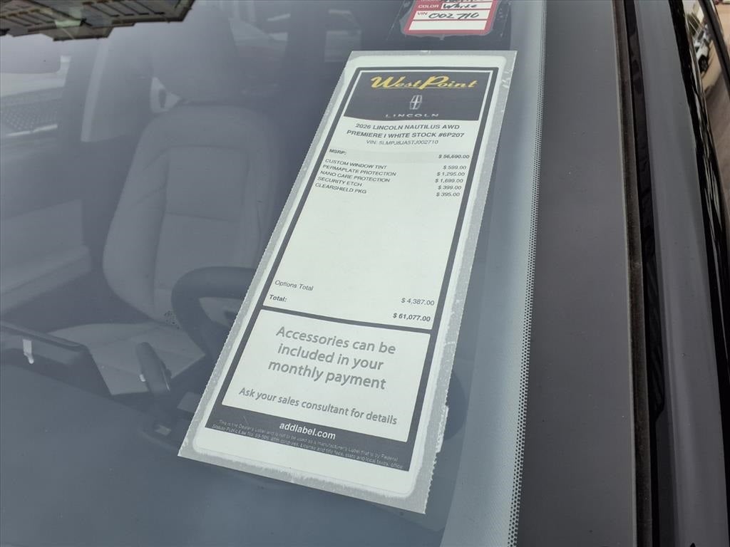 West Point Lincoln Sugar Land is excited to offer this good-looking 2026 Lincoln Nautilus Premiere in White Platinum Clearcoat Metallic with Medium Light Space Gray interior. Well equipped with Equipment Group 101A (19 Bright Machined Aluminum Wheels, BlueCruise Equipped (4-Years Included), Lincoln App, Lincoln Digital Experience, Lincoln Soft Touch Heated Front Captain's Chairs, Radio: AM/FM Premium Audio, and SiriusXM with 360L), Lincoln Connectivity Package, 10 Speakers, 4-Wheel Disc Brakes, ABS brakes, Air Conditioning, Alloy wheels, AM/FM radio: SiriusXM with 360L, Apple CarPlay/Android Auto, Auto High-beam Headlights, Auto tilt-away steering wheel, Auto-dimming Rear-View mirror, Automatic temperature control, Brake assist, Bumpers: body-color, Compass, Delay-off headlights, Driver door bin, Driver vanity mirror, Dual front impact airbags, Dual front side impact airbags, Electronic Stability Control, Emergency communication system: 911 Assist, Exterior Parking Camera Rear, Four wheel independent suspension, Front anti-roll bar, Front Bucket Seats, Front Center Armrest w/Storage, Front dual zone A/C, Front reading lights, Fully automatic headlights, Garage door transmitter, Heated door mirrors, Heated front seats, Heated steering wheel, Illuminated entry, Knee airbag, Leather steering wheel, Low tire pressure warning, Memory seat, Navigation System, Occupant sensing airbag, Outside temperature display, Overhead airbag, Overhead console, Panic alarm, Passenger door bin, Passenger vanity mirror, Power door mirrors, Power driver seat, Power Liftgate, Power passenger seat, Power steering, Power windows, Radio data system, Rain sensing wipers, Rear anti-roll bar, Rear reading lights, Rear seat center armrest, Rear window defroster, Rear window wiper, Remote keyless entry, Security system, Speed control, Speed-sensing steering, Speed-Sensitive Wipers, Split folding rear seat, Spoiler, Steering wheel memory, Steering wheel mounted audio controls, Tachometer, Telescoping steering wheel, Tilt steering wheel, Traction control, Trip computer, Turn signal indicator mirrors, and Variably intermittent wipers.