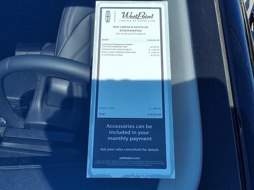 West Point Lincoln Sugar Land is delighted to offer this attractive-looking 2026 Lincoln Nautilus Premiere in Black Metallic with Black Onyx interior. Well equipped with Equipment Group 101A (19 Bright Machined Aluminum Wheels, BlueCruise Equipped (4-Years Included), Lincoln Digital Experience, Lincoln Soft Touch Heated Front Captain's Chairs, Radio: AM/FM Premium Audio, and SiriusXM with 360L), Jet Appearance Package (Black Exterior Elements, Body-Color Exterior Elements, Molded in Color - Lower Cladding and Wheel Arches, and Wheels: 20 Bright Machined Aluminum), Lincoln Connectivity Package, 10 Speakers, 4-Wheel Disc Brakes, ABS brakes, Air Conditioning, Alloy wheels, AM/FM radio: SiriusXM with 360L, Apple CarPlay/Android Auto, Auto High-beam Headlights, Auto tilt-away steering wheel, Auto-dimming Rear-View mirror, Automatic temperature control, Brake assist, Bumpers: body-color, Compass, Delay-off headlights, Driver door bin, Driver vanity mirror, Dual front impact airbags, Dual front side impact airbags, Electronic Stability Control, Emergency communication system: 911 Assist, Exterior Parking Camera Rear, Four wheel independent suspension, Front anti-roll bar, Front Bucket Seats, Front Center Armrest w/Storage, Front dual zone A/C, Front reading lights, Fully automatic headlights, Garage door transmitter, Heated door mirrors, Heated front seats, Heated steering wheel, Illuminated entry, Knee airbag, Leather steering wheel, Low tire pressure warning, Memory seat, Navigation System, Occupant sensing airbag, Outside temperature display, Overhead airbag, Overhead console, Panic alarm, Passenger door bin, Passenger vanity mirror, Power door mirrors, Power driver seat, Power Liftgate, Power passenger seat, Power steering, Power windows, Radio data system, Rain sensing wipers, Rear anti-roll bar, Rear reading lights, Rear seat center armrest, Rear window defroster, Rear window wiper, Remote keyless entry, Security system, Speed control, Speed-sensing steering, Speed-Sensitive Wipers, Split folding rear seat, Spoiler, Steering wheel memory, Steering wheel mounted audio controls, Tachometer, Telescoping steering wheel, Tilt steering wheel, Traction control, Trip computer, Turn signal indicator mirrors, and Variably intermittent wipers.