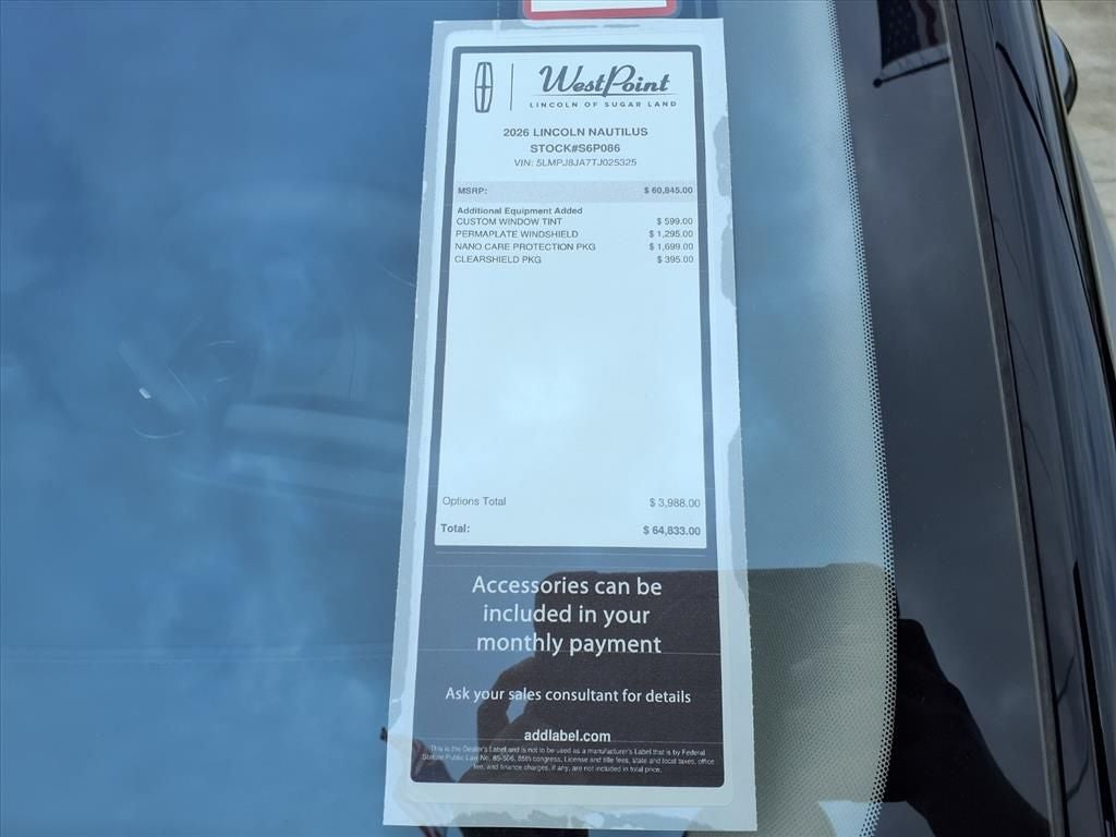 West Point Lincoln Sugar Land is excited to offer this great-looking 2026 Lincoln Nautilus Premiere in Gray with Black Onyx interior. Well equipped with Equipment Group 101A (19 Bright Machined Aluminum Wheels, BlueCruise Equipped (4-Years Included), Lincoln App, Lincoln Digital Experience, Lincoln Soft Touch Heated Front Captain's Chairs, Radio: AM/FM Premium Audio, and SiriusXM with 360L), Jet Appearance Package (Black Exterior Elements, Body-Color Exterior Elements, Molded in Color - Lower Cladding and Wheel Arches, and Wheels: 20 Bright Machined Aluminum), Lincoln Connectivity Package, 10 Speakers, 4-Wheel Disc Brakes, ABS brakes, Air Conditioning, Alloy wheels, AM/FM radio: SiriusXM with 360L, Apple CarPlay/Android Auto, Auto High-beam Headlights, Auto tilt-away steering wheel, Auto-dimming Rear-View mirror, Automatic temperature control, Brake assist, Bumpers: body-color, Compass, Delay-off headlights, Driver door bin, Driver vanity mirror, Dual front impact airbags, Dual front side impact airbags, Electronic Stability Control, Emergency communication system: 911 Assist, Exterior Parking Camera Rear, Four wheel independent suspension, Front anti-roll bar, Front Bucket Seats, Front Center Armrest w/Storage, Front dual zone A/C, Front reading lights, Fully automatic headlights, Garage door transmitter, Heated door mirrors, Heated front seats, Heated steering wheel, Illuminated entry, Knee airbag, Leather steering wheel, Low tire pressure warning, Memory seat, Navigation System, Occupant sensing airbag, Outside temperature display, Overhead airbag, Overhead console, Panic alarm, Passenger door bin, Passenger vanity mirror, Power door mirrors, Power driver seat, Power Liftgate, Power passenger seat, Power steering, Power windows, Radio data system, Rain sensing wipers, Rear anti-roll bar, Rear reading lights, Rear seat center armrest, Rear window defroster, Rear window wiper, Remote keyless entry, Security system, Speed control, Speed-sensing steering, Speed-Sensitive Wipers, Split folding rear seat, Spoiler, Steering wheel memory, Steering wheel mounted audio controls, Tachometer, Telescoping steering wheel, Tilt steering wheel, Traction control, Trip computer, Turn signal indicator mirrors, and Variably intermittent wipers.